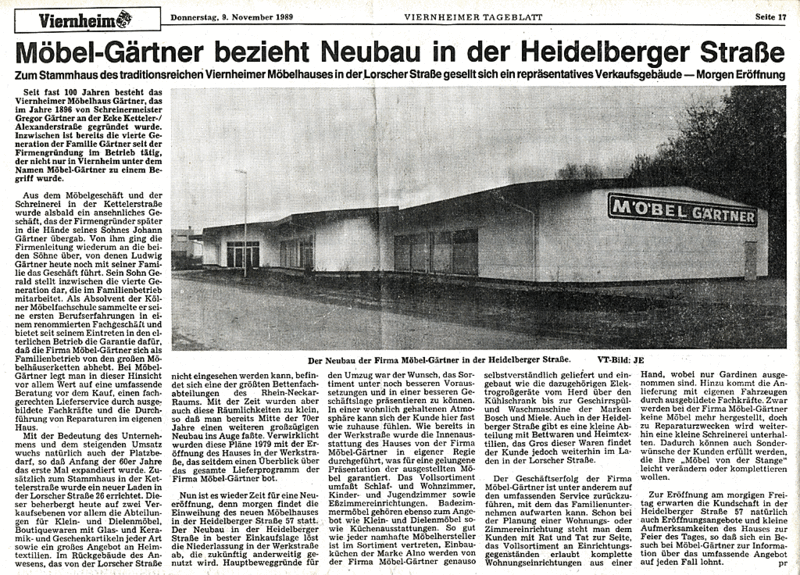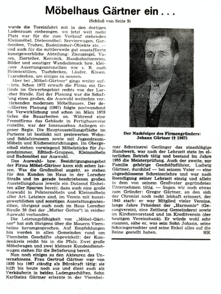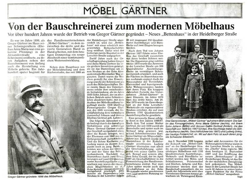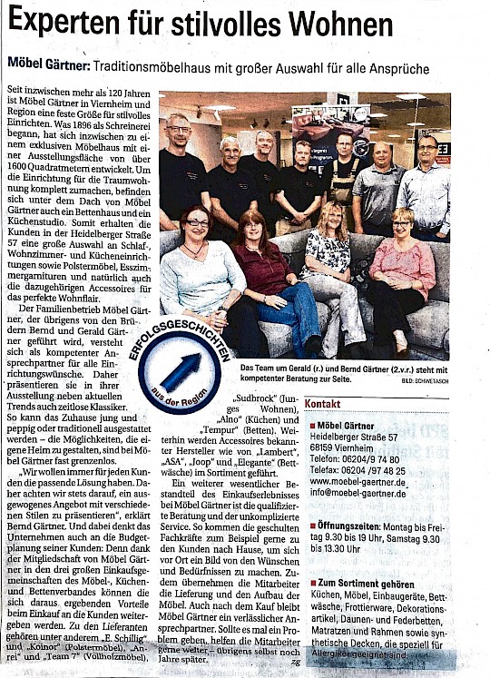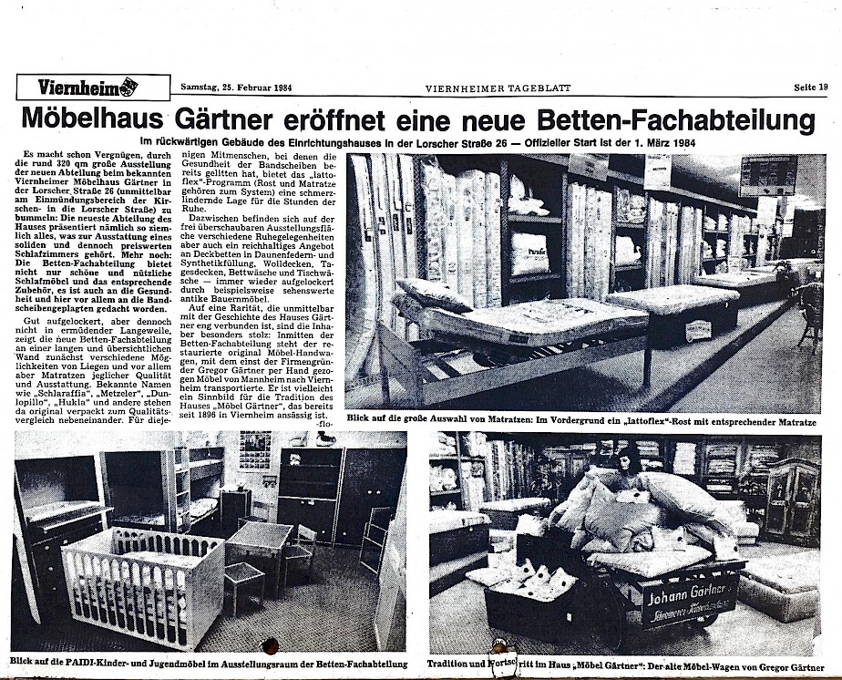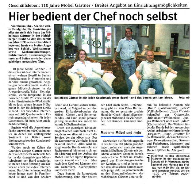 Begonnen hat Möbel Gärtner 1896 als Schreinerei. Inzwischen ist auf einer Ausstellungsfläche von ca 1500 qm eine wahre Inspirationsquelle entstanden, welche ein breites Angebot von Schlaf-, Wohnzimmer- sowie Kücheneinrichtungen, Polstermöbeln, Esszimmergarnituren, Betten und den dazugehörigen Accessoires bietet.