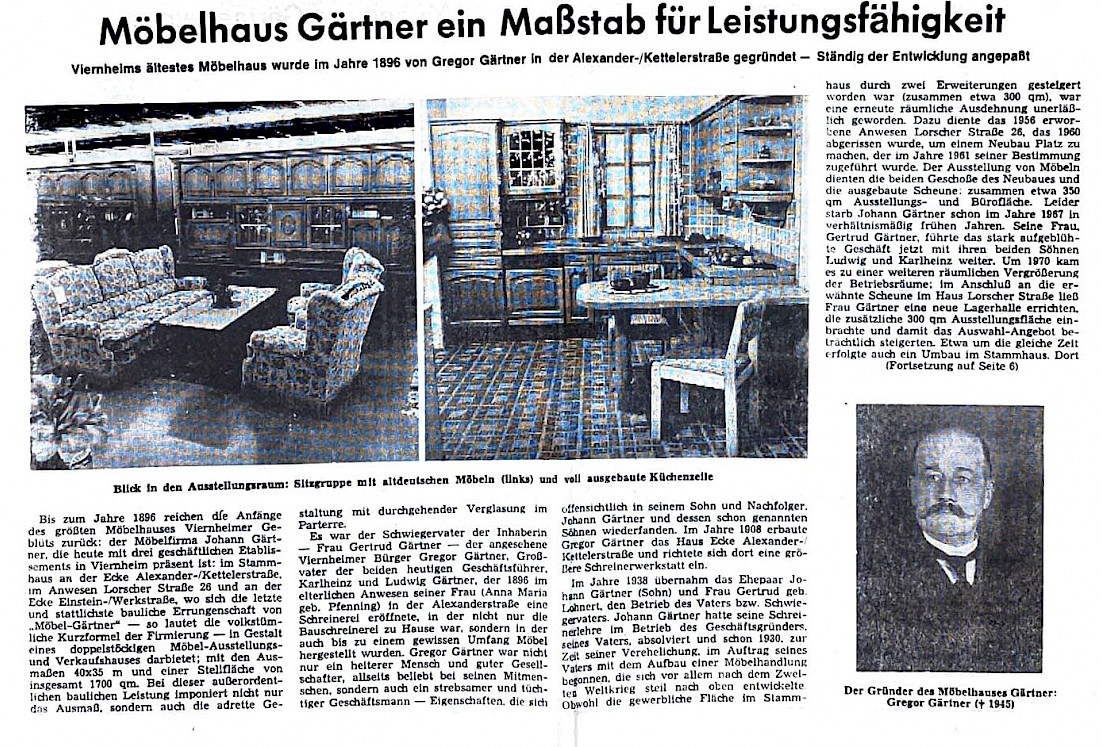 Begonnen hat Möbel Gärtner 1896 als Schreinerei. Inzwischen ist auf einer Ausstellungsfläche von ca 1500 qm eine wahre Inspirationsquelle entstanden, welche ein breites Angebot von Schlaf-, Wohnzimmer- sowie Kücheneinrichtungen, Polstermöbeln, Esszimmergarnituren, Betten und den dazugehörigen Accessoires bietet.